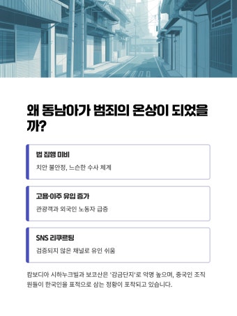 첫째, **'풍선 효과'와 사법 공조 회피**입니다. 기존 거점이었던 국가들에서 한국 경찰과의 공조 수사 경험이 쌓이고 '골든트라이앵글' 일부가 여행금지 구역으로 지정되면서, 범죄 조직들은 상대적으로 사법 공조의 손길이 덜 닿는 캄보디아로 근거지를 옮겼습니다. 둘째, **중국 자본의 유입과 범죄 단지 형성**입니다. 캄보디아의 시아누크빌, 프놈펜 인근 '망고단지', 포이펫 등은 중국 자본을 중심으로 한 불법 온라인 도박 및 사이버 사기 범죄 단지의 핵심 지역으로 변모했습니다.